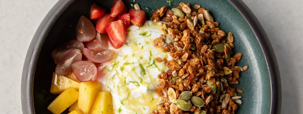 Mevsimsel meyveler, ballı yoğurt, el yapımı granola, lime zest
