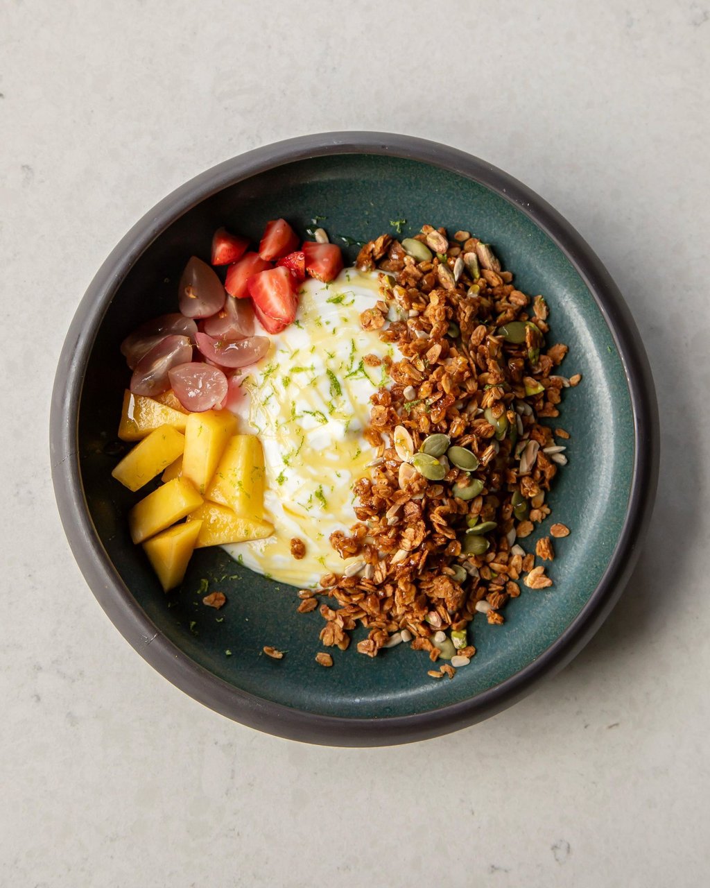 Mevsim meyveleri, ballı yoğurt, el yapımı granola, lime zest