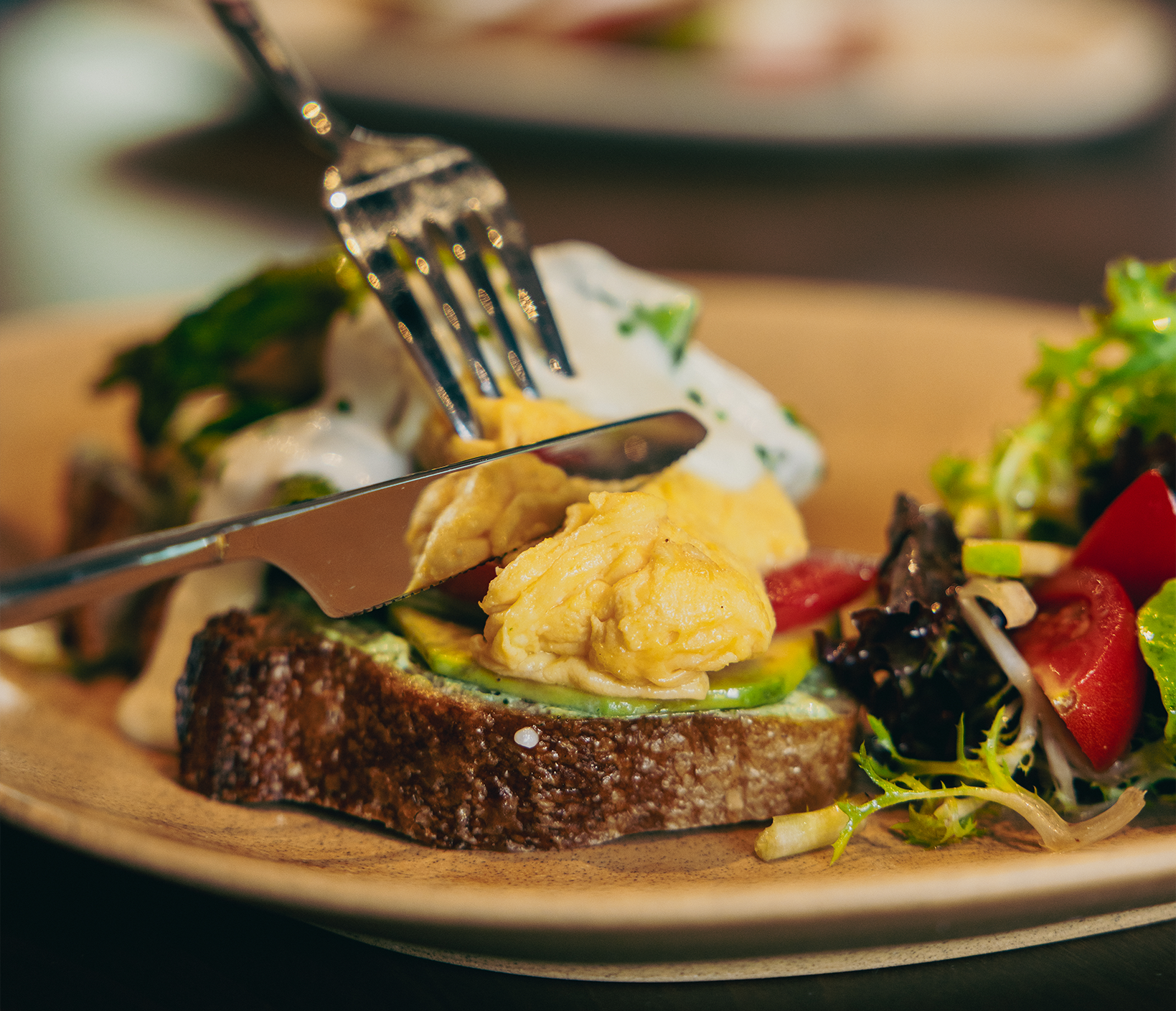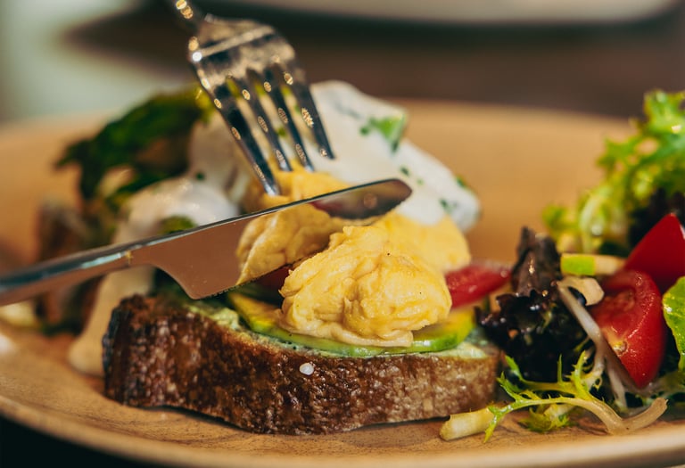 El yapımı ekşi maya ekmek, avokado, kuşkonmaz, peynir sos, çırpılmış yumurta, roka, mini salata
